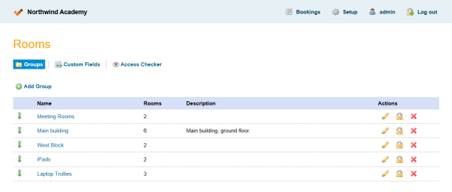 Drag-and-drop a room group using the green up/down arrow icon to change the order the groups are displayed in on the Bookings page. The new position will be saved automatically.