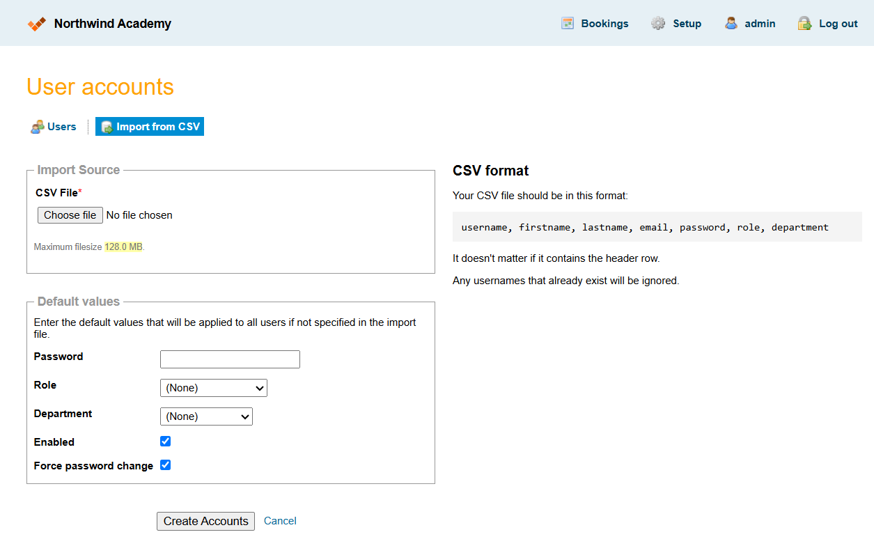 The Role and Department can be populated using either the name as they appear in classroombookings, or their internal ID. To find a role or department ID, edit the record then look for the last number in the URL in the address bar of your browser.