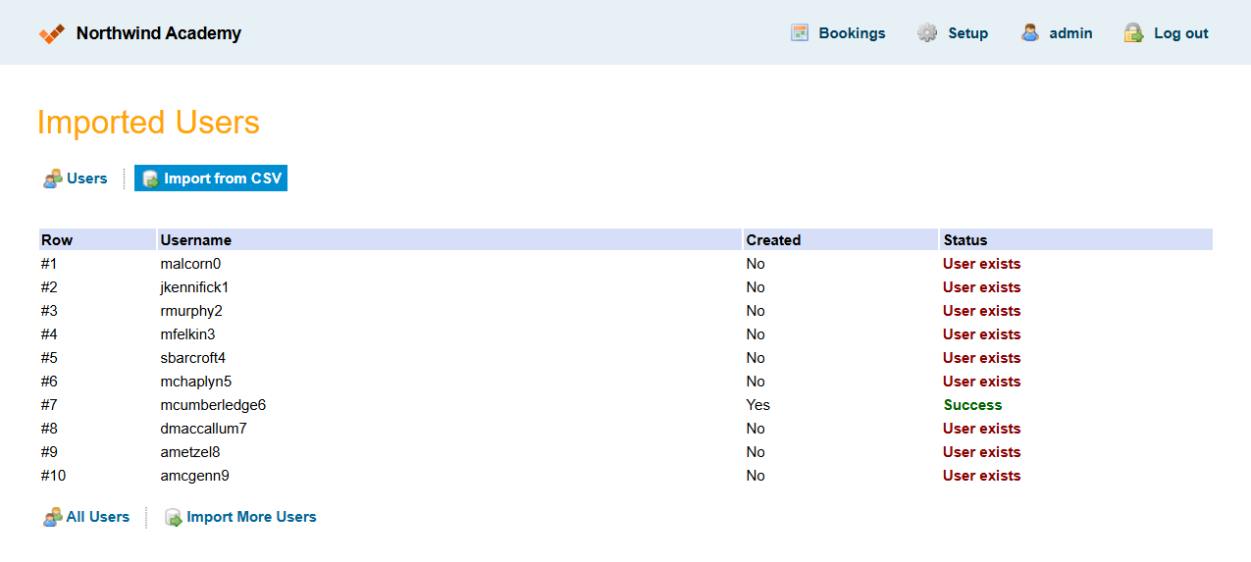 A results page will be shown after they have been processed, displaying the success or failure status of each entry in the CSV file.