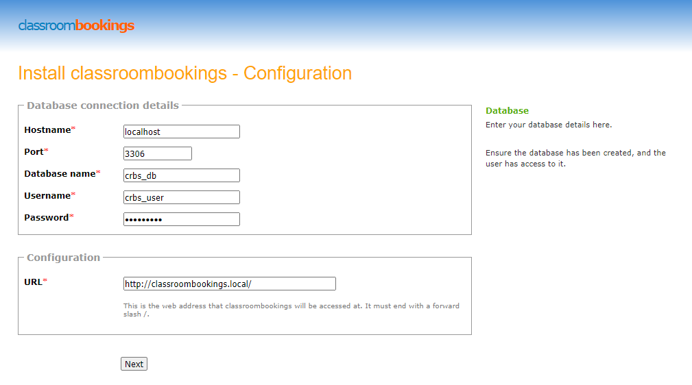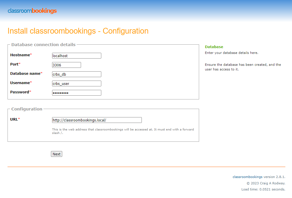 In the Configuration section, ensure the auto-detected URL matches the address that will be used by all users to access classroombookings. If it is not correct, change it to the address that will be used.
