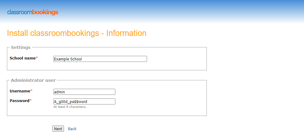 Using a browser, visit the IP address or URL on the server where the classroombookings files were extracted to that are served by the web server. You should see the following page.