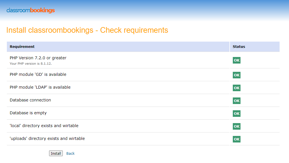 - Ensure the web server is configured to host PHP applications, and create a space for classroombookings (e.g. a folder or virtual host) that is accessible over HTTP.